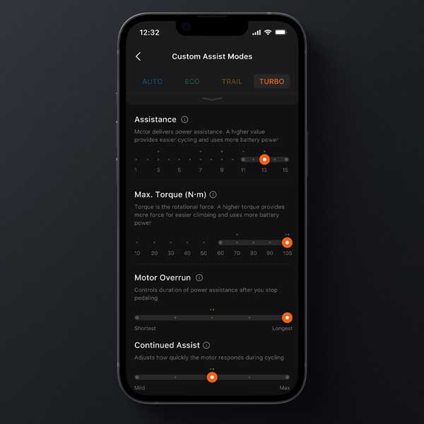 Il sistema Avinox consente una personalizzazione completa delle modalità di assistenza tramite l’app Avinox Ride. Per ciascuna modalità (ad eccezione della Boost) è possibile regolare il livello di assistenza, autonomia, coppia massima, assistenza all’avvio, assistenza continua alla pedalata.