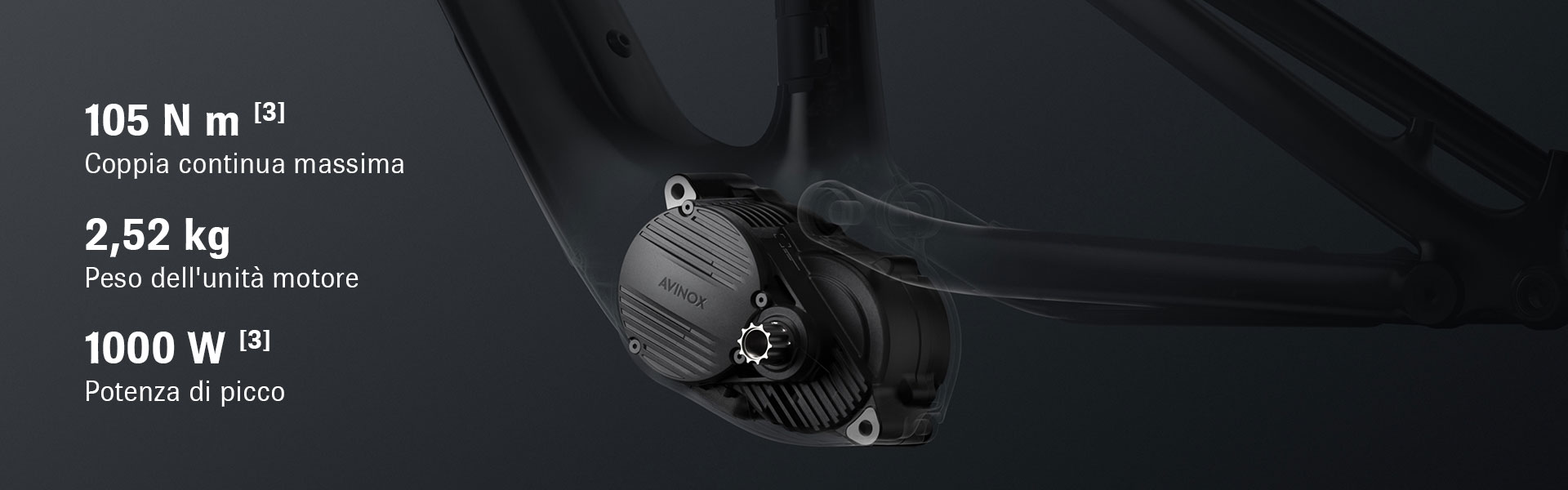 Pedalata potente, stabile e imperturbabile su ogni terreno. L’unità motore Avinox M1 è estremamente compatta — grande quanto il palmo di una mano — e pesa solo 2,52 kg, ma è in grado di erogare una coppia massima di 105 Nm. Questa combinazione garantisce una spinta decisa quando le condizioni lo richiedono, permettendo di affrontare senza difficoltà anche i tratti più impervi, mantenendo sempre un controllo preciso della bici.